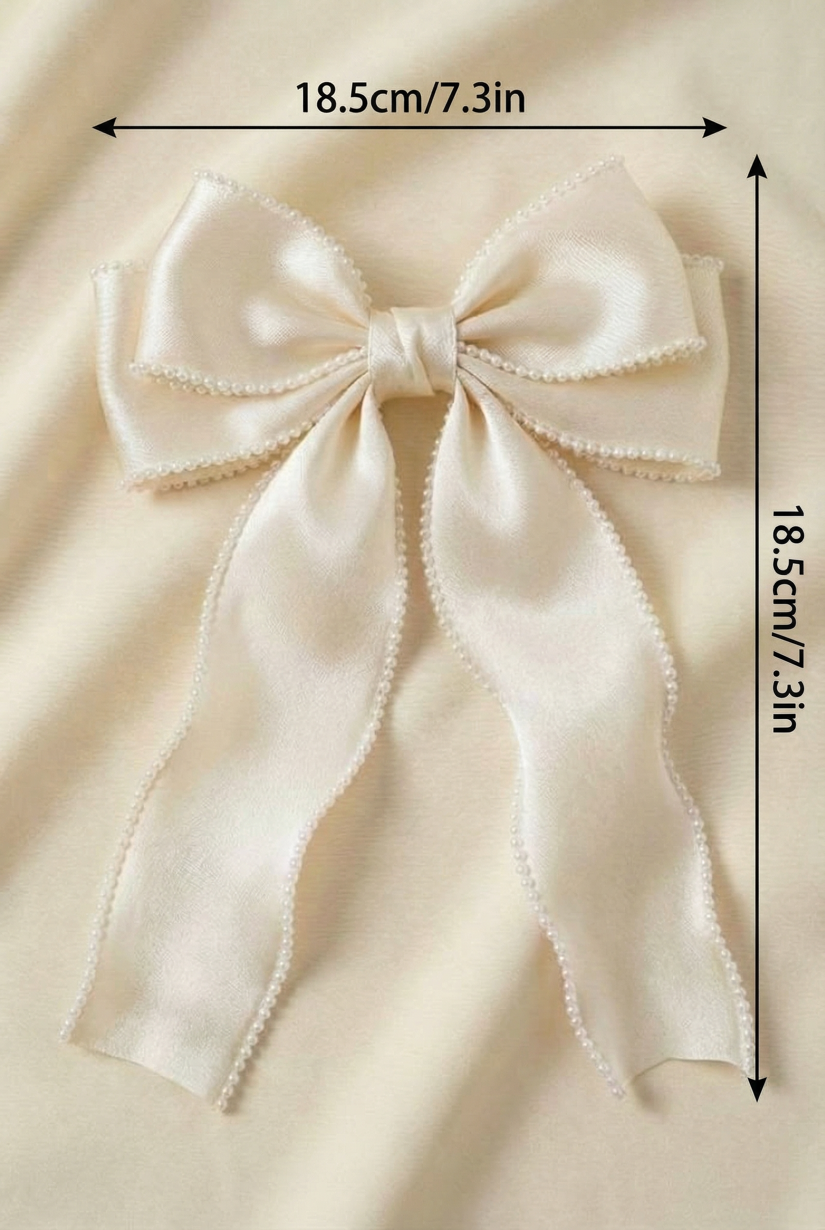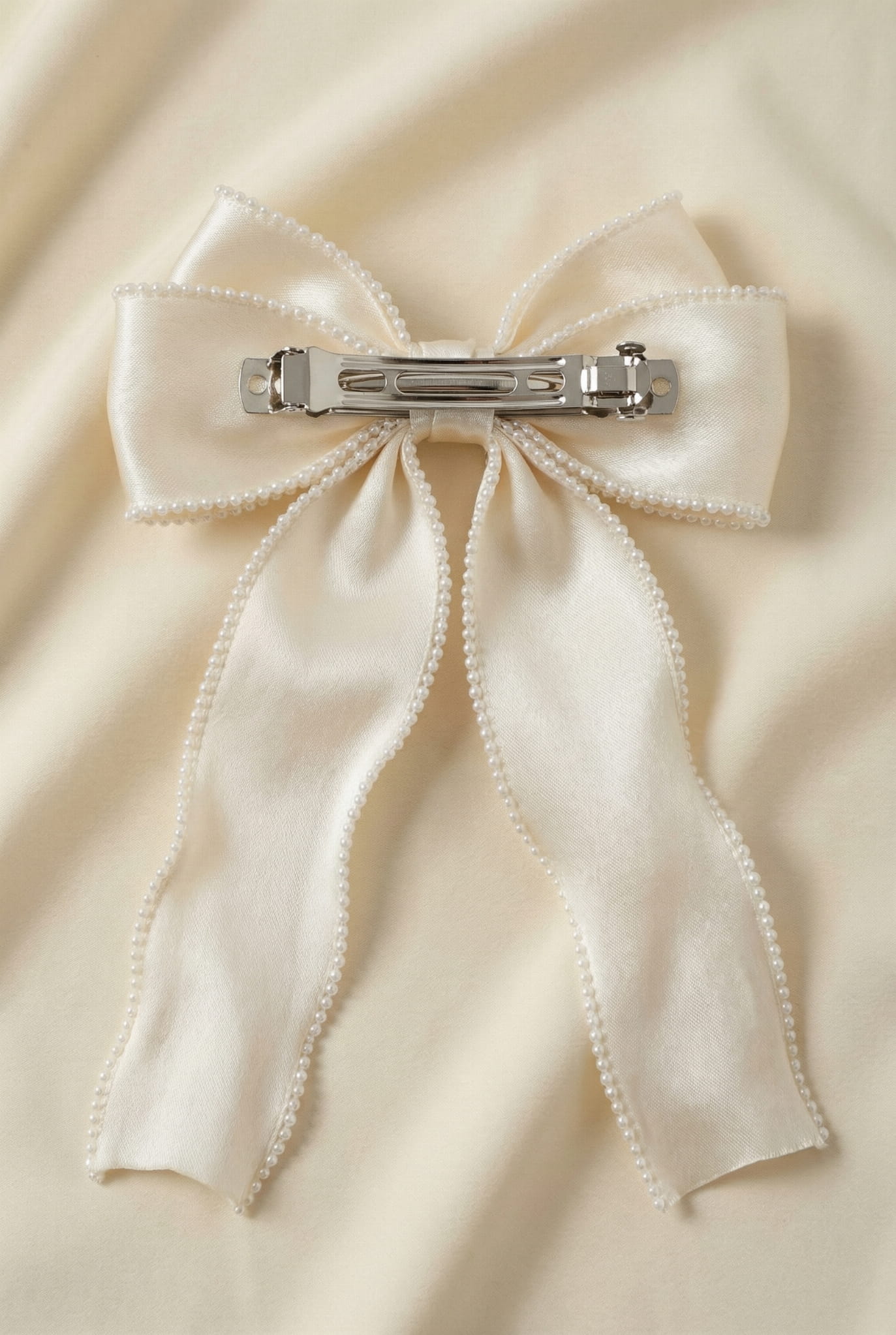 De haarspeld is vervaardigd uit hoogwaardige organza die soepel valt en een luchtige, chique look creëert. De zorgvuldig aangebrachte pareltjes langs de randen voegen een vleugje luxe toe. Dankzij het royale formaat springt de strik direct in het oog, terwijl het delicate ontwerp toch verfijnd en subtiel blijft.